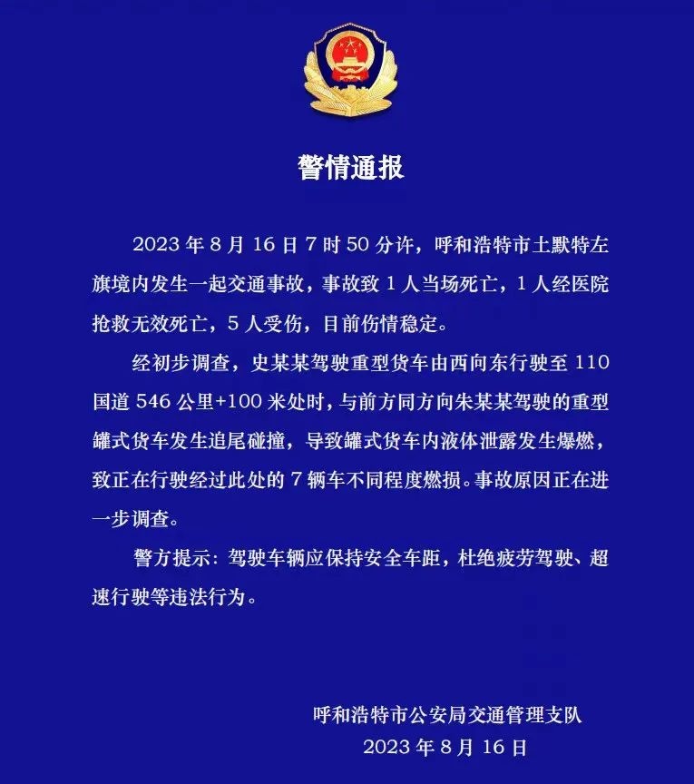 当晚22时33分,呼和浩特市公安局交通管理支队发布警情通报称,8月16日7时50分许,呼和浩特市土默特左旗境内发生一起交通事故,事故致1人当场死亡,1人经医院抢救无效死亡,5人受伤,目前伤情稳定。